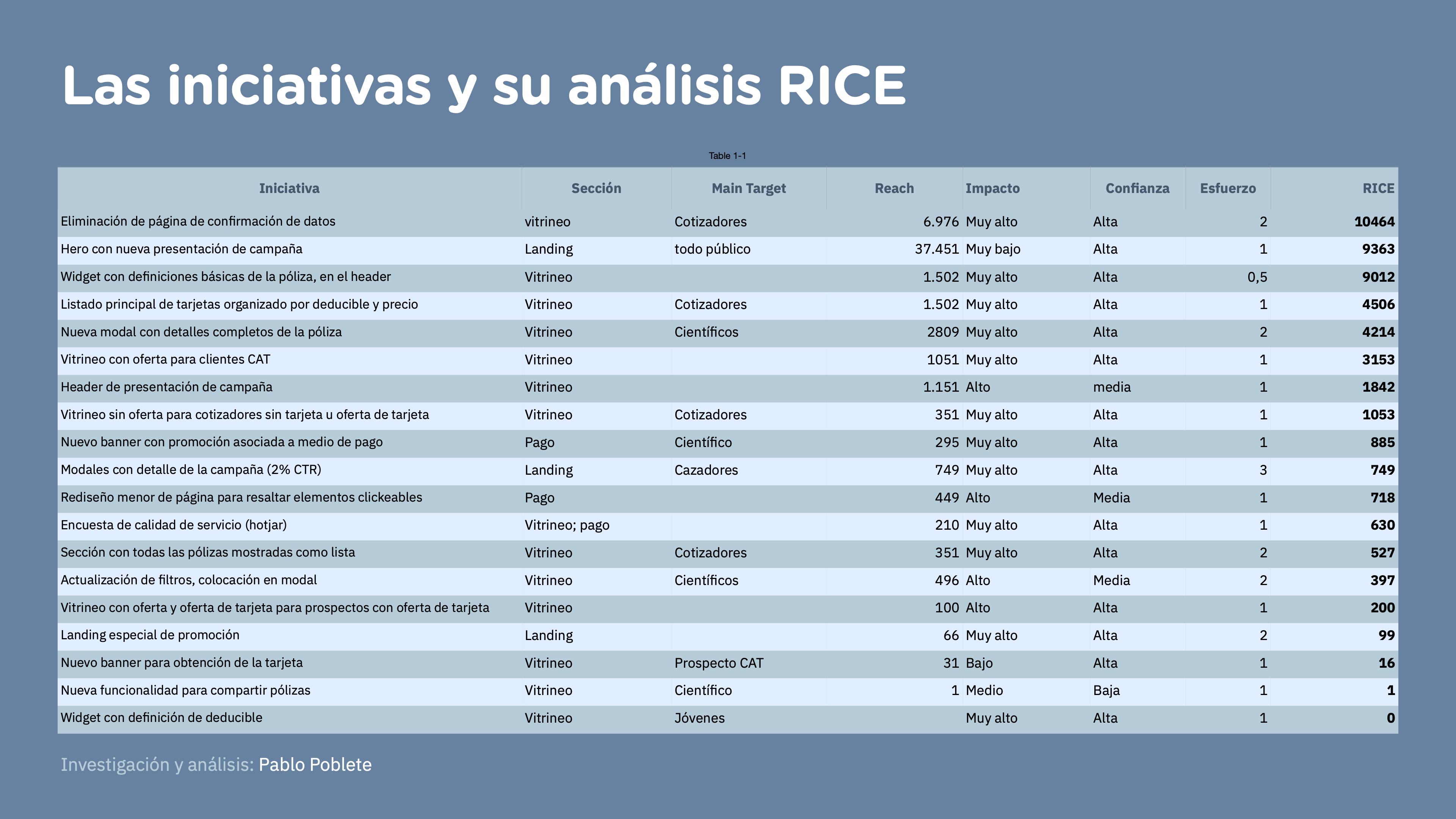 Resultado: 19 iniciativas priorizadas objetivamente, con la eliminación de pantallas innecesarias como #1 (RICE: 10,464).